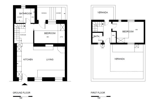 The project deals with the reconstruction of a very old two-story stone residence at the picturesque center of Parikia, the largest town on Paros Island, in order to be reused as a two-berdroom vacation residence. The residence is situated on a quite commonly-to-see minute plot of a total of 69sq.m area with a 7m long front façade. A short open-air area of 7,50sq.m resides on the inside area of the plot, providing a privatized ground floor veranda. The residence extends on two levels, with a first level of 62sq.m and a second level of 22sq.m. A relatively large veranda of 32sq.m resides upstairs, providing an unobstructed view to the picturesque town roads.
