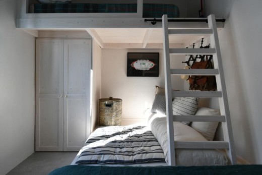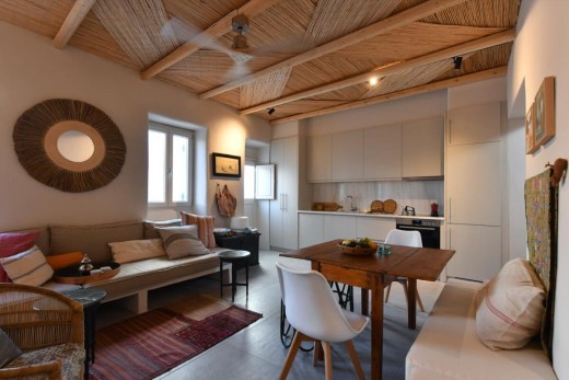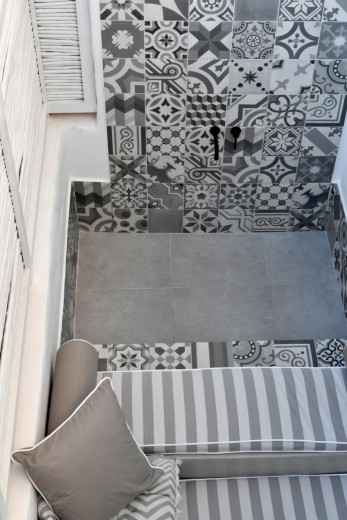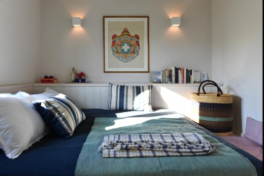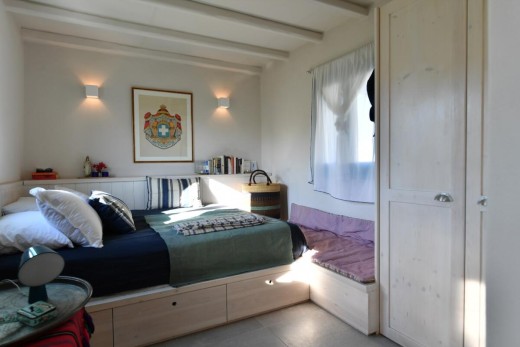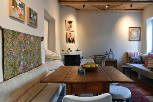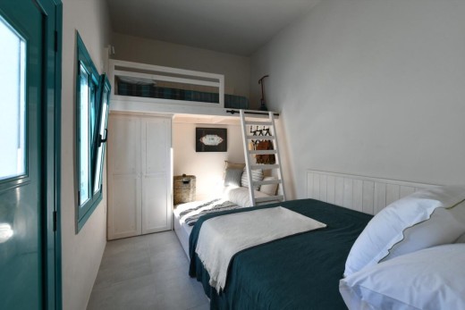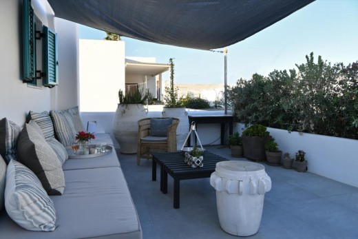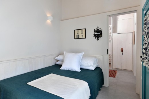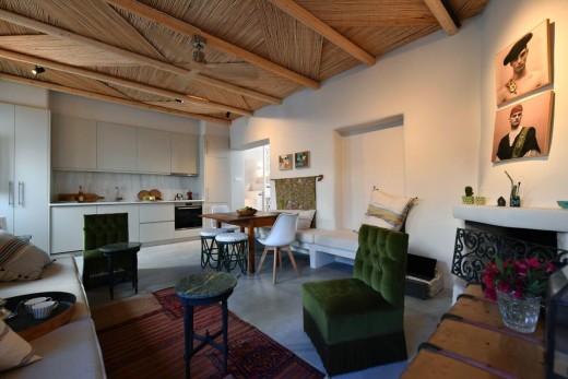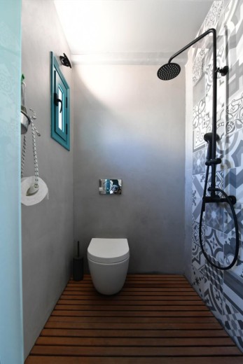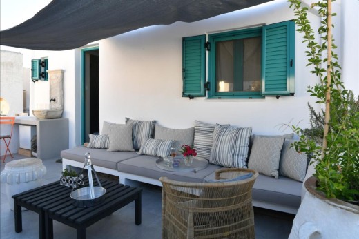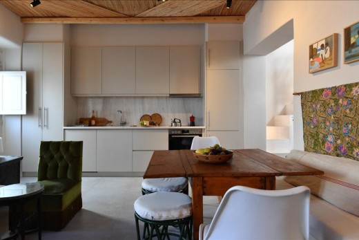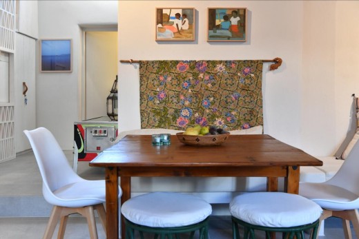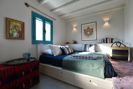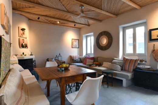 The materials have been carefully selected with a view to managing the balance between respecting and assimilating the traditional architecture on the one hand, and consolidating the new available material and building techniques on the other hand. Therefore, wood has been extensively used to construct the staircase, the tiny bedroom attic on the ground floor, as well as a floor elevation in the two bedrooms that actually serves as the bed space itself providing additional storage room. The furniture is closely associated to the island style; wood tables and chairs, fabric cushions and throws; traditional decoration. The living room walls are decorated with art pieces of well-known Greek photographers and traditional Greek embroideries.