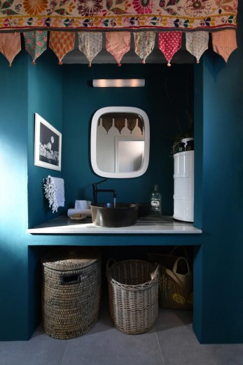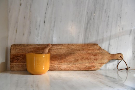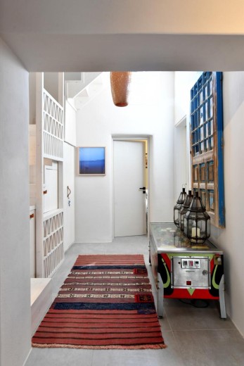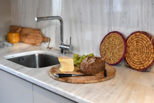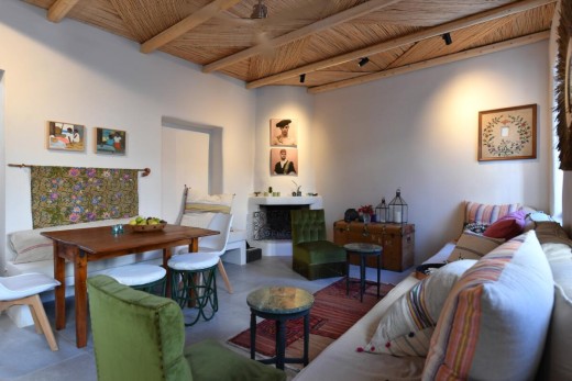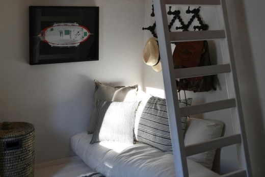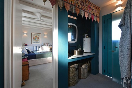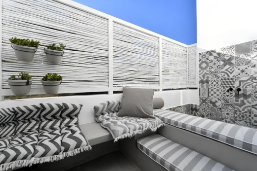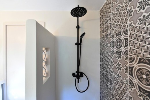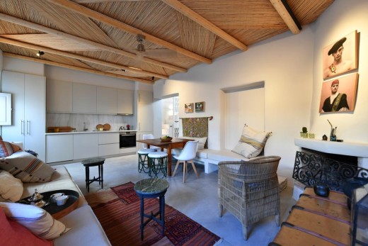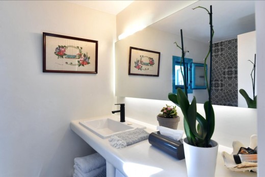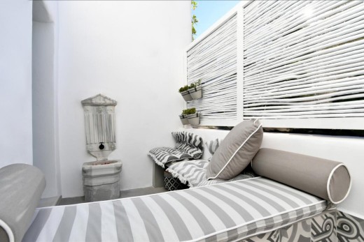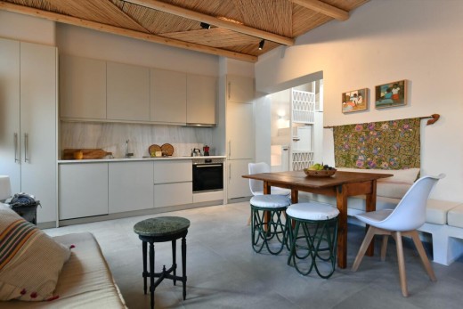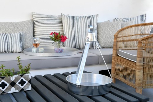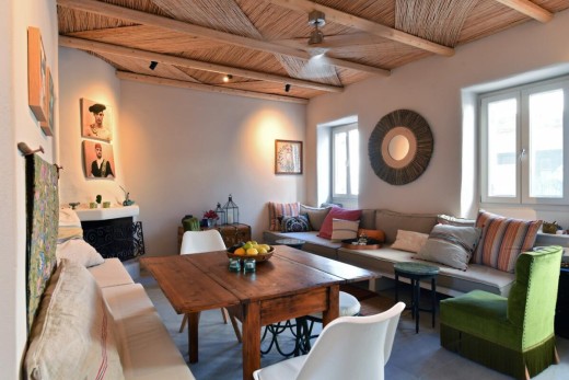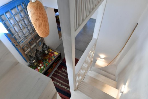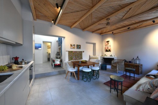 The materials have been carefully selected with a view to managing the balance between respecting and assimilating the traditional architecture on the one hand, and consolidating the new available material and building techniques on the other hand. Therefore, wood has been extensively used to construct the staircase, the tiny bedroom attic on the ground floor, as well as a floor elevation in the two bedrooms that actually serves as the bed space itself providing additional storage room. The furniture is closely associated to the island style; wood tables and chairs, fabric cushions and throws; traditional decoration. The living room walls are decorated with art pieces of well-known Greek photographers and traditional Greek embroideries.