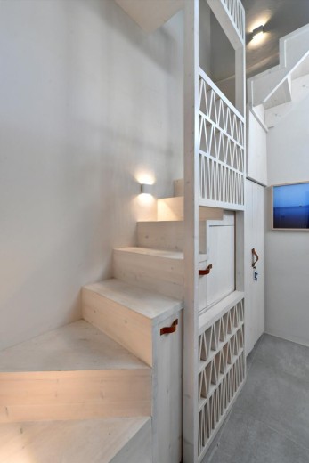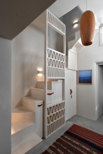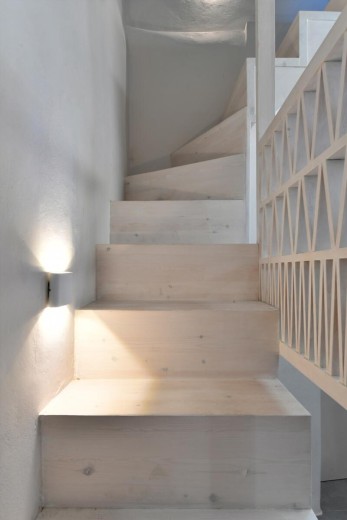 The main architectural objective was to preserve and propound the identity elements of the old traditional residence, like the façade formation with few and small openings, the corner fireplace, several wall cavities that serve either as shelves or space sparing. Additionally, a certain preoccupation has been given to the staircase in the heart of the house, almost a pivotal one, by enlarging the allocated space for offering a cosy vertical access to the first level. Equipped with a synthesis of short storage rooms of different dimensions, the staircase assumes a point of magnitude. The residence had been provided with a very small, steel, circular staircase. Through the reconstruction, wood has been used instead of steel; triangular formations that refer to traditional pigeon-holes have been chosen instead of vertical forms; a rectangular outline has been derived from the masonry outline instead of that of a circular one.